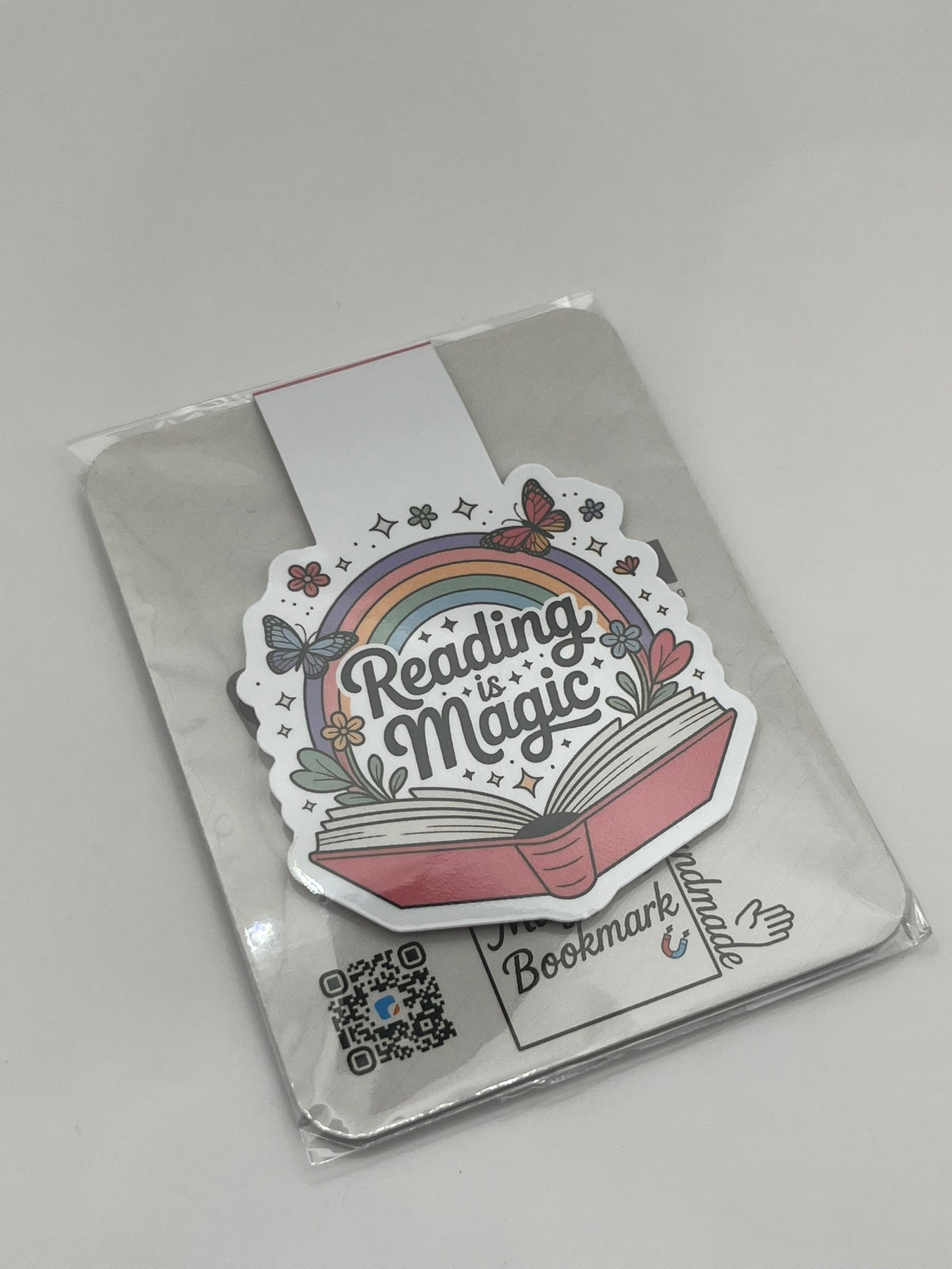 Bring a touch of wonder to every chapter with this enchanting “Reading Is Magic” Magnetic Bookmark! Featuring a beautifully illustrated rainbow, fluttering butterflies, soft pastel flowers, and an open book bursting with magic, this bookmark is perfect for readers who believe that stories truly create worlds.